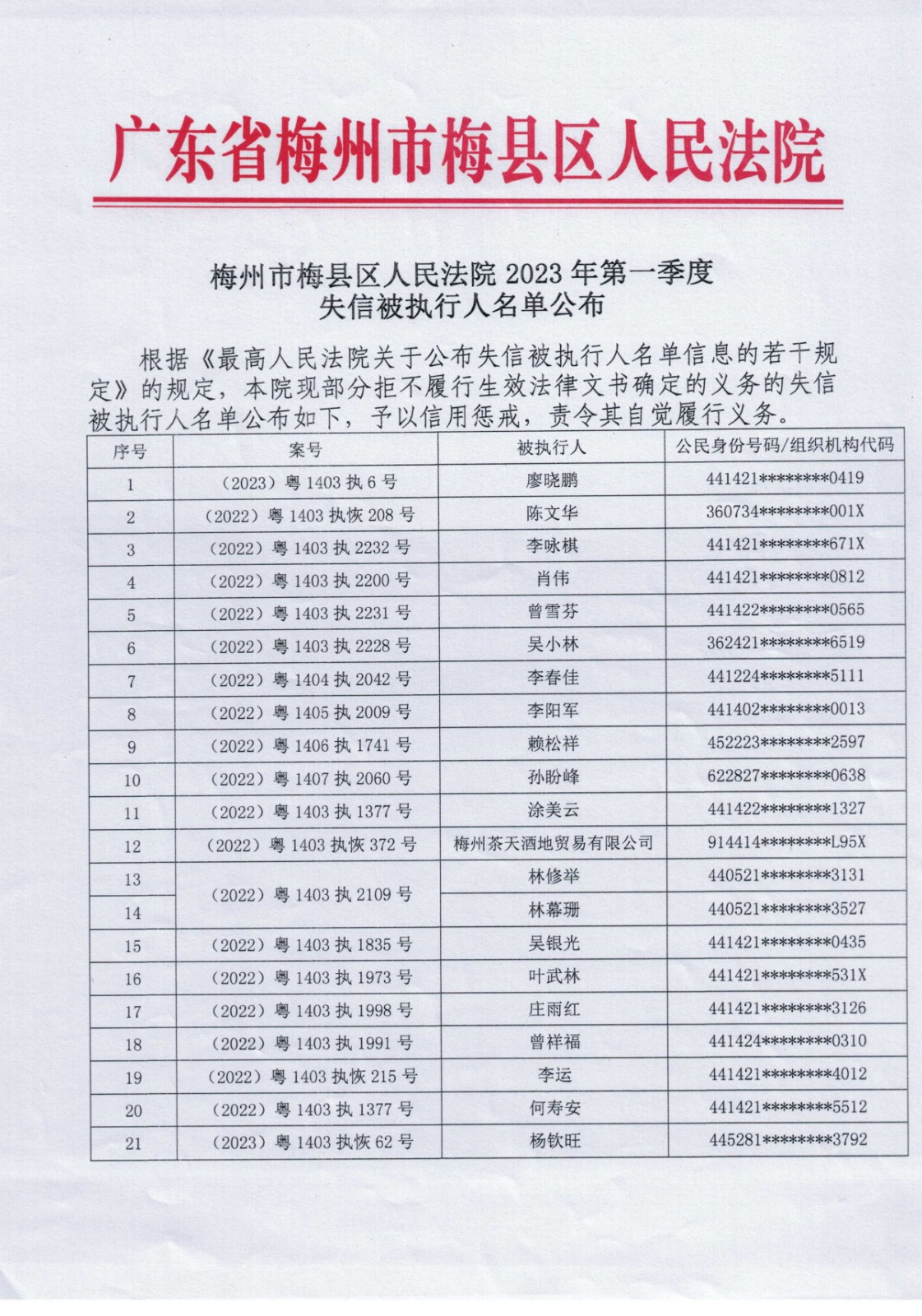 梅州市梅县区人民法院2023年第一季度失信被执行人名单公布