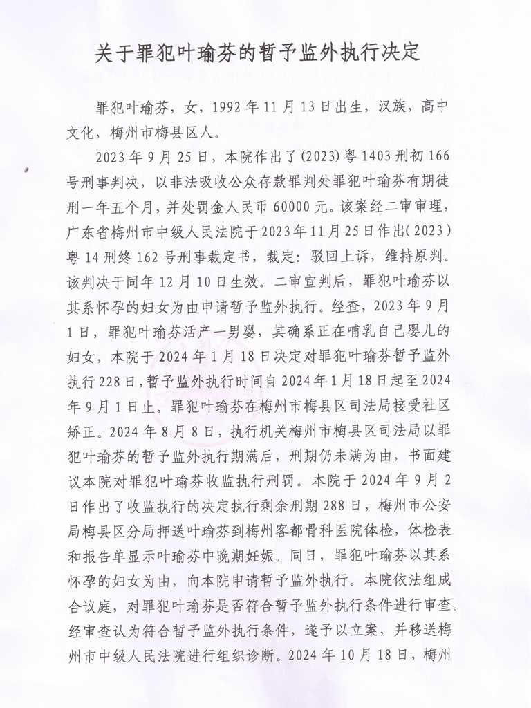 关于罪犯叶瑜芬的暂予监外执行决定